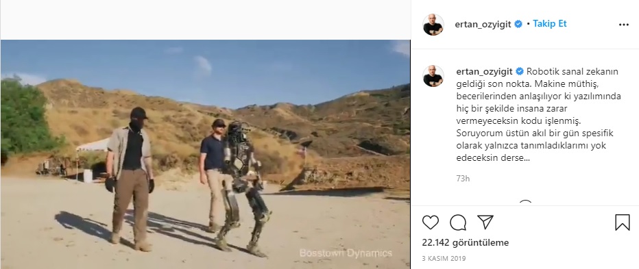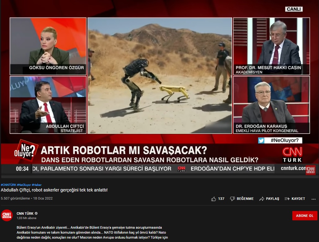 Abdullah Çiftçi: “Şimdi ileri düzey makine öğrenimi denilen ileri düzey yapay zekalarla donatılan robotlar bunlar. Şimdi herhangi bir biyokimyasal kimyasal gazdan etkilenmiyorlar. Kimyasal savaş bu robotlar için bir anlamı yok. Virüsten soğuktan iklimden etkilenmiyorlar. Önümüzdeki dönem savaşın değişik bir şeklini göreceğiz.”