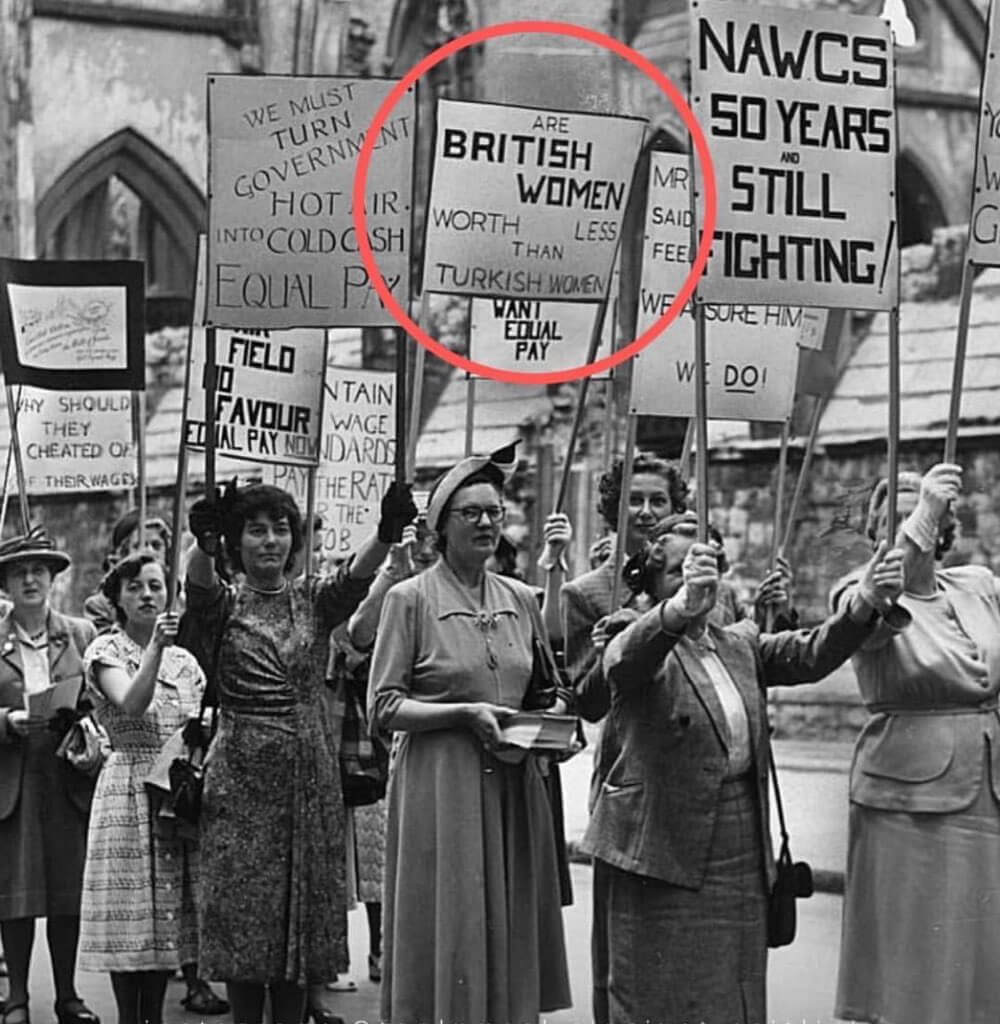 “Britanyalı kadınlar, Türk kadınlarından daha mı değersiz?” yazılı pankartın görüldüğü fotoğrafın kaydedildiği yürüyüş 1930’lu değil, 1960’lı yıllarda yapılmış