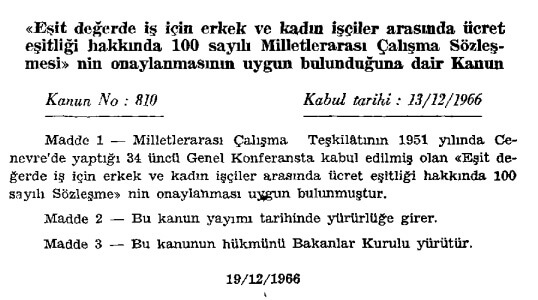 “100 No’lu Eşit Ücret Sözleşmesi” 13 Aralık 1966 tarihli 810 sayılı “Eşit değerde iş için erkek ve kadın işçiler arasında ücret eşitliği hakkında 100 sayılı Milletlerarası Çalışma Sözleşmesi’nin onaylanmasının uygun bulunduğuna dair Kanun” ile Türkiye Büyük Millet Meclisi (TBMM) tarafından kabul edildi.