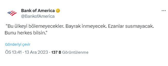 Yine 13 Aralık 2023 günü Borsa İstanbul’a kote hisse senetlerinde satış baskısının yoğunlaştığı, BIST100 gibi çeşitli endekslerin zirve seviyelerinden yaklaşık %10-12 düştüğü günlerde, yaşanan düşüşün sebebi olarak görülen ve kullandığı algoritmik robotla ünlü Bank of America’nın sosyal medya hesabından atılan bir tweet görüntüsüne mizahî amaçla “Bu ülkeyi bölemeyecekler. Bayrak inmeyecek. Ezanlar susmayacak. Bunu herkes bilsin.” ifadeleri dijital ortamda eklendi.