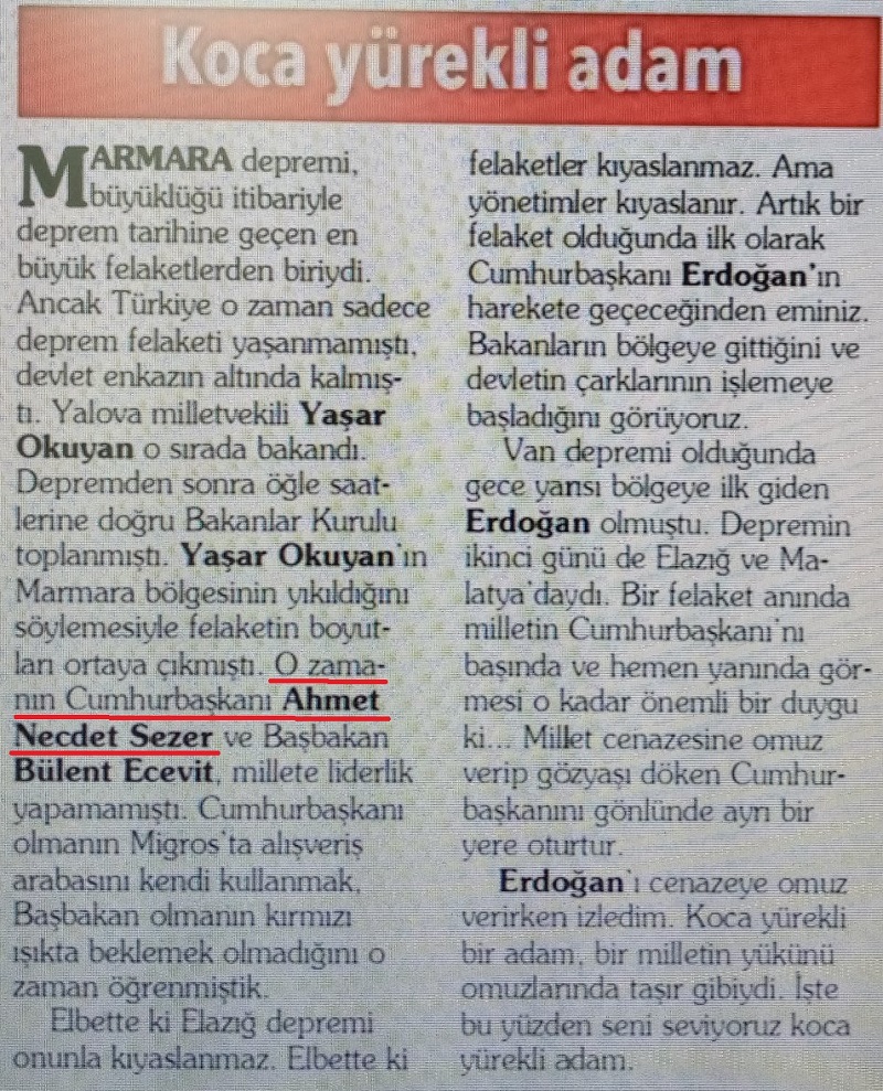 “Marmara depremi, büyüklüğü itibariyle deprem tarihine geçen en büyük felaketlerden biriydi. Ancak Türkiye o zaman sadece deprem felaketi yaşanmamıştı, devlet enkazın altında kalmıştı. Yalova milletvekili Yaşar Okuyan o sırada bakandı. Depremden sonra öğle saatlerine doğru Bakanlar Kurulu toplanmıştı. Yaşar Okuyan’ın Marmara bölgesinin yıkıldığını söylemesiyle felaketin boyutları ortaya çıkmıştı. O zamanın Cumhurbaşkanı Ahmet Necdet Sezer ve Başbakan Bülent Ecevit, millete liderlik yapamamıştı. Cumhurbaşkanı olmanın Migros’ta alışveriş arabasını kendi kullanmak, Başbakan olmanın kırmızı ışıkta beklemek olmadığını o zaman öğrenmiştik”