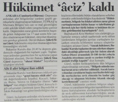18 Ağustos 1999 tarihli Cumhuriyet gazetesinin kapağında deprem bölgesine hükûmet yetkililerinin deprem bölgesine giderek bilgi aldığı aktarılmıştı.