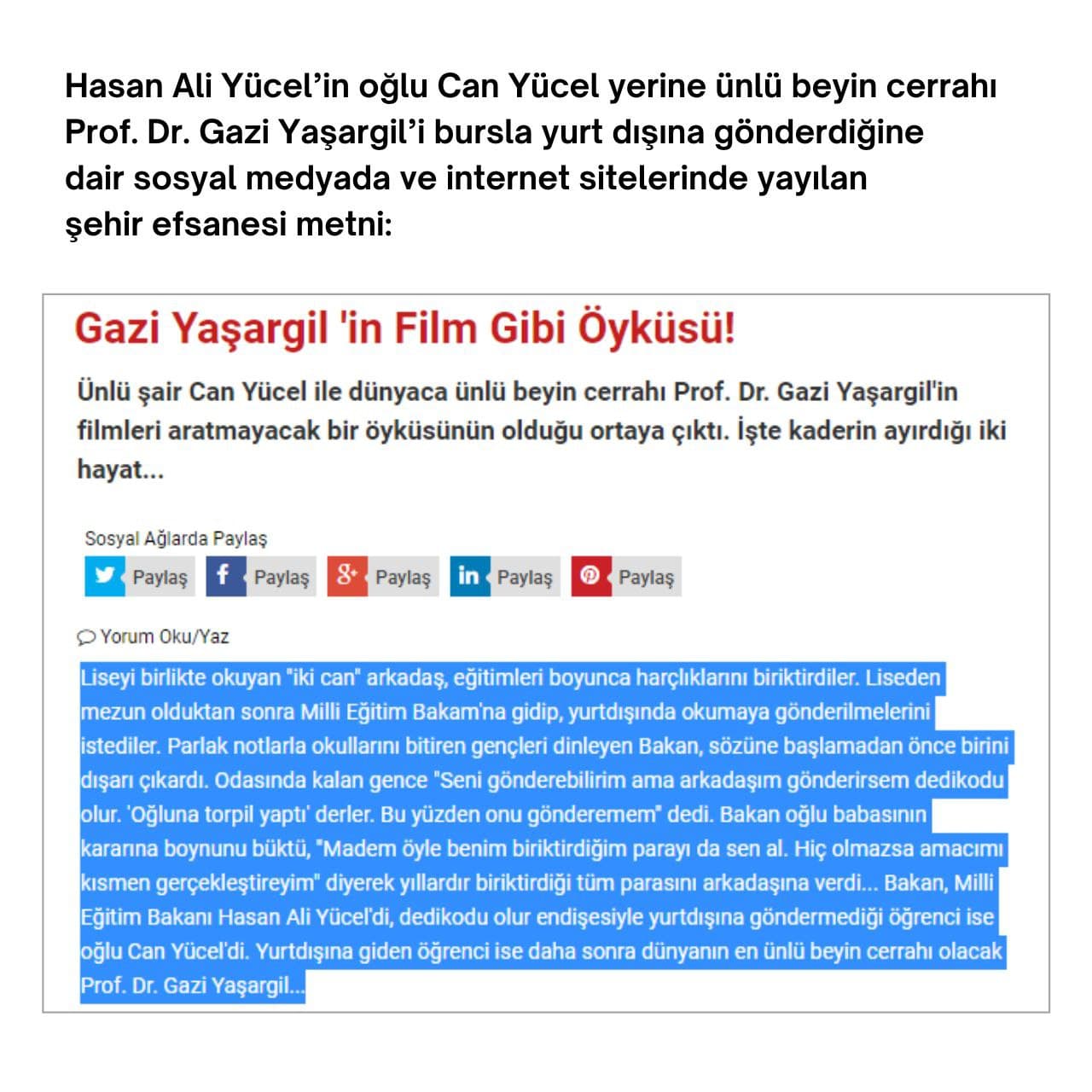 Hasan Âli Yücel’in oğlu Can Yücel yerine ünlü beyin cerrahı Prof. Dr. Gazi Yaşargil’i bursla yurt dışına gönderdiğine dair sosyal medyada ve internet sitelerinde yayılan şehir efsanesi metni şu şekilde: