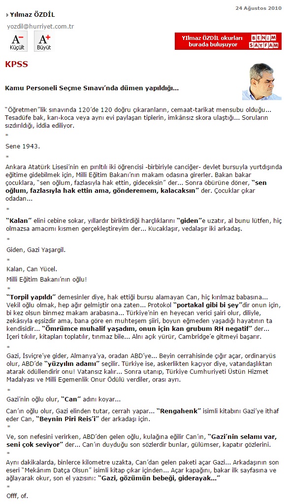 "1940’lı yıllar Ankara... O dönem Gazi Lisesi’nde hem birbirleriyle çok iyi anlaşan hem de sürekli rekabet eden iki arkadaş vardır. Gazi, fen derslerinde başarılıdır. Can da edebiyatta... Ve ikisi de, okulun en iyi öğrencileridir. Derken bir gün okul biter. İki arkadaş mezun olur. Sonra ikisi de o dönem Milli Eğitim Bakanlığı’nın başlattığı yurtdışına öğrenci gönderme programına başvurur. Rivayete göre, başvurular sonuçlanınca dönemin Milli Eğitim Bakanı, Gazi’yi çağırır. “Seni yollayacağız” der, “ama arkadaşına söyle o gidemez. Çünkü onu yollarsak, Bakan kendi oğluna iltimas geçti, derler.” Gazi odadan çıkar. Can’a durumu anlatır. Can da o güne kadar biriktirdiği ne kadar para varsa hepsini Gazi’ye verir. “Senin daha çok ihtiyacın olacak” der. Sonra aradan yıllar geçer. Şair olan Can evlenir. Çocukları olur. Ve çocuklarından Yeni Hasan, tıpkı babasının arkadaşı Gazi gibi doktor olmaya karar verir. Gazi durumu öğrenir. Bunun üzerine, oğlanı kendisinin okutacağını söyler. Yeni Hasan, Galatasaray Lisesi’ni bitirir. Önce Fransa’ya, ardından Kanada’ya gider. Ve Gazi’nin desteğiyle, dünyanın en iyi tıp okullarında okur. Aradan yine yıllar geçer. Yeni Hasan, Kanada’ya yerleşir. İki oğlundan birinin adını Gazi koyar. Bu arada tıpkı Gazi gibi, kendi alanında çok yükseklere gelir. En sonunda da bir gün göz patolojisinde dünyanın en büyük ödülünü kazanır. Ödülü alan Prof. Dr. Yeni Hasan Yücel’dir. Babası, şair Can Yücel. Dedesi, eski Milli Eğitim Bakanı Hasan Âli Yücel. Babasının arkadaşı ise dünyanın en ünlü beyin cerrahlarından Prof. Dr. Gazi Yaşargil. Bu olayı, geçen hafta glokom hastalığı alanında yaptığı büyük bir keşifle Lewis Rudin Ödülü’nü kazanan Prof. Dr. Yücel’den dinledim. Kanada’daydı, telefonla konuştuk. Size babanız mı anlattı bu öyküyü, dedim. “Ne babam bahsetti ne de Gazi Yaşargil’in bu konuyu açtığını gördüm. Ben başka yerlerden duydum. Tek bildiğim, benim bütün öğrenim masraflarımı Gazi Yaşargil’in karşıladığıydı” dedi."