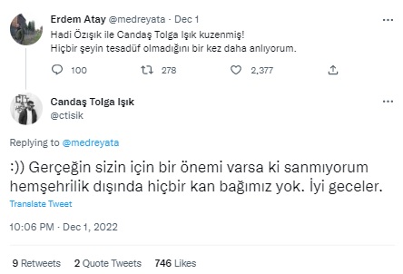 Erdem Atay’ın “Hadi Özışık ile Candaş Tolga Işık kuzenmiş! Hiçbir şeyin tesadüf olmadığını bir kez daha anlıyorum.” söylemini içeren paylaşımına verdiği yanıtta Candaş Tolga Işık “Gerçeğin sizin için bir önemi varsa ki sanmıyorum hemşehrilik dışında hiçbir kan bağımız yok. İyi geceler.” ifadelerini kullanmıştı.