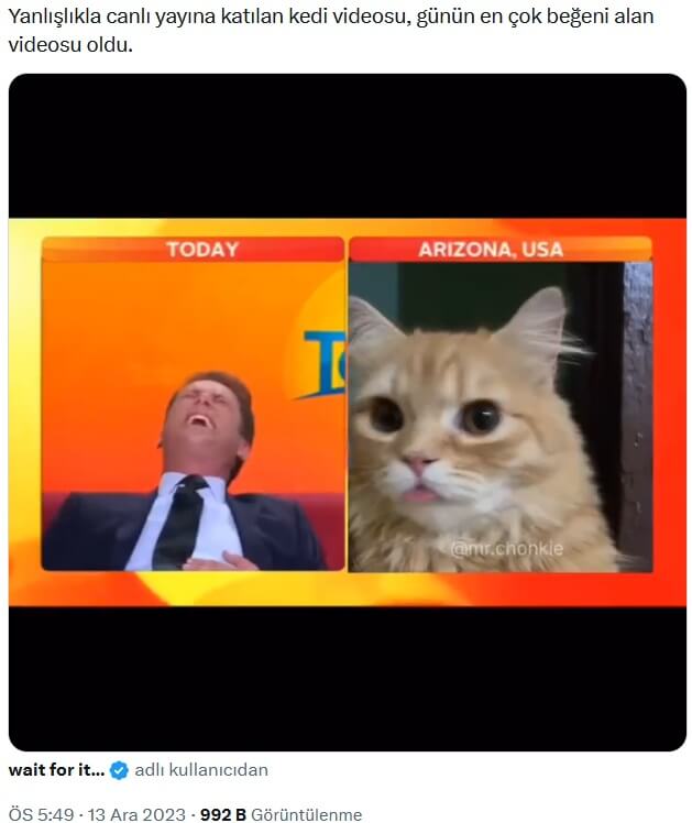 ZAM Haber (@ZAMajans): “Yanlışlıkla canlı yayına katılan kedi videosu, günün en çok beğeni alan videosu oldu.”