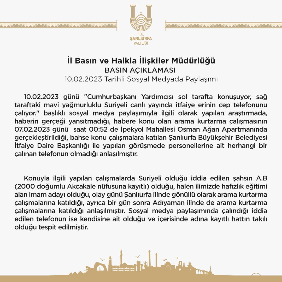 “10.02.2023 günü “Cumhurbaşkanı Yardımcısı sol tarafta konuşuyor, sağ taraftaki mavi yağmurluklu Suriyeli canlı yayında itfaiye erinin cep telefonunu çalıyor.” başlıklı sosyal medya paylaşımıyla ilgili olarak yapılan araştırmada, haberin gerçeği yansıtmadığı, habere konu olan arama kurtarma çalışmasının 06.02.2023 günü saat 00:52 de İpekyol Mahallesi Osman Ağan Apartmanında gerçekleştirildiği, bahse konu çalışmalara katılan Şanlıurfa Büyükşehir Belediyesi İtfaiye Daire Başkanlığı ile yapılan görüşmede personellerine ait herhangi bir çalınan telefonun olmadığı anlaşılmıştır.