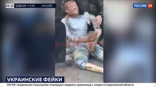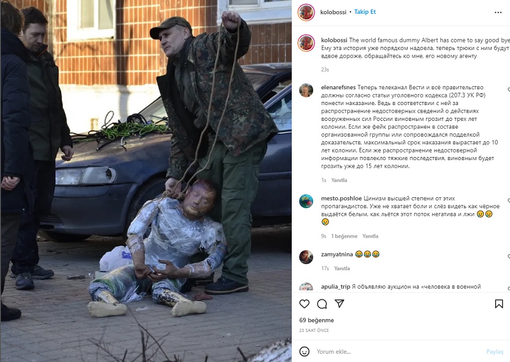 Rus devlet kanalı Rossiya 24, askerî üniformalı iki kişinin bir mankeni bantladığı görülen videoyu Ukrayna’da sahte ceset hazırlama videosu olduğu iddiasıyla yayımlamıştı.