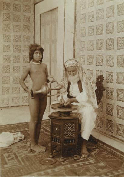 “Suudi şeyh namaza hazırlanıyor. Yanındaki çırılçıplak çocuk onun cariyesi” notuyla paylaşılan fotoğraf Marcel Eugène Chatelain tarafından 1910’da Tunus’ta çekilmiş.