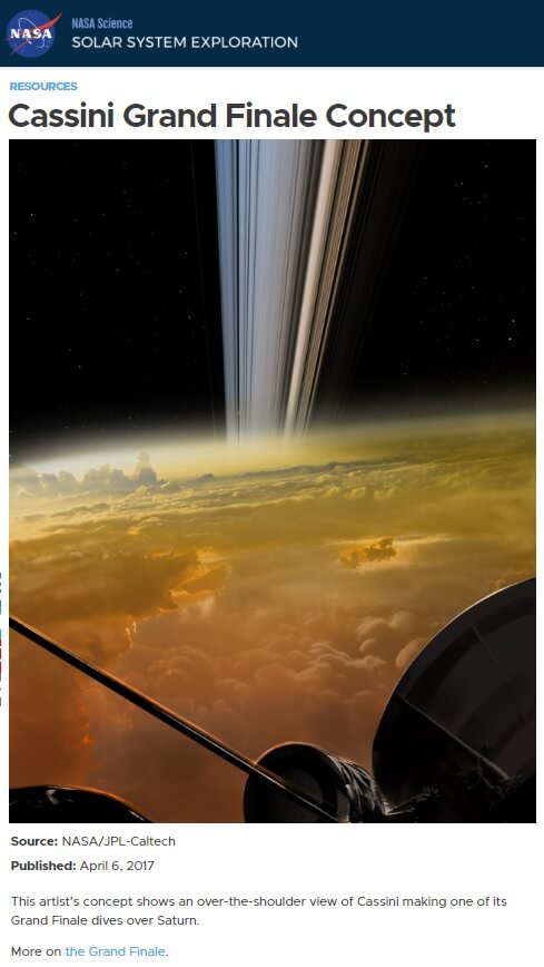 Görüntünün kaynağı NASA internet sitesinde “Cassini Büyük Final Konsepti” (“Cassini Grand Finale Concept”) başlığıyla paylaşılan NASA/JPL-Caltech tarafından 6 Nisan 2017 günü hazırlanan tasarım.