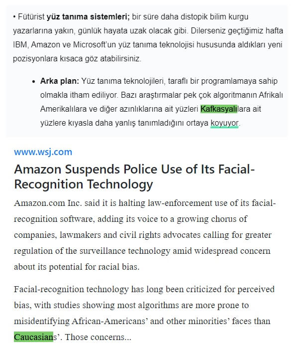 Aktardığımız çeviri hatasını örneklendirelim. Aposto tarafından hazırlanan Pareto adlı bültenin 15 Haziran 2020 tarihli sayısında Wall Street Journal’dan yapılan çeviride “beyaz ırk”ı tanımlayan “caucasian” kelimesi “Kafkasyalı” olarak tercüme edilmişti: