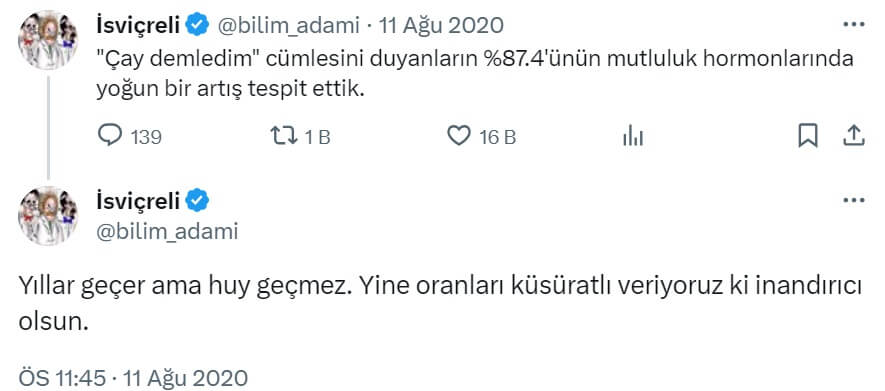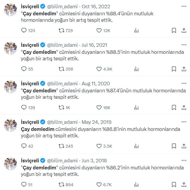Twitter hesabından 2018-2022 yılları arasında atılan tweetlerde “Çay demledim” cümlesini duyanların mutluluk hormonlarındaki artış oranı olarak %88,4, %88,5, %87,4, %86,8 ve %86,2 gibi küsüratlı sayılar uydurulmuş.