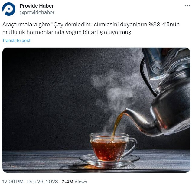 Provide Haber (@providehaber): “Araştırmalara göre “Çay demledim” cümlesini duyanların %88.4’ünün mutluluk hormonlarında yoğun bir artış oluyormuş”