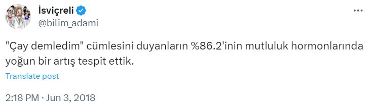Bahsi geçen sosyal medya hesabından 3 Haziran 2018 tarihinde atılan ve “Çay demledim” cümlesini duyanların %86.2’inin mutluluk hormonlarında yoğun bir artış tespit ettik.” ifadelerini içeren tweet zaman içerisinde gerçek sanılarak paylaşılmış ve yaygınlık kazanmış.