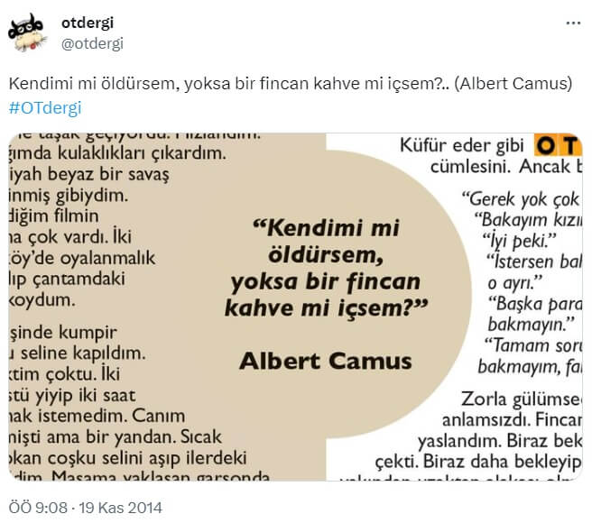 Eserlerinde hayatın anlamsızlığı ve kutsal bir amaçtan yoksunluğu gibi temel konuları ele alan Camus, “Mutlu Ölüm” adlı kitabında Marseault ve Roland Zagreus arasında geçen diyalogda benzer bir varoluş sancısını şu satırlarla aktarmış: