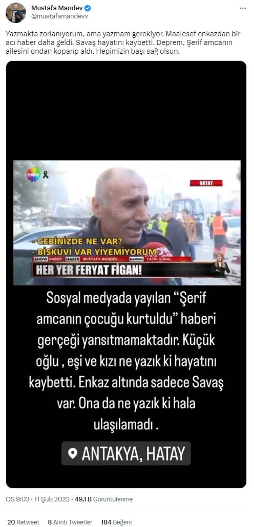 Kendisi ile röportaj yapan Show Haber’den Mustafa Mandev de Şerif Amca’nın tüm aile fertlerinin vefat ettiğini “Yazmakta zorlanıyorum, ama yazmam gerekiyor. Maalesef enkazdan bir acı haber daha geldi. Savaş hayatını kaybetti. Deprem, Şerif amcanın ailesini ondan koparıp aldı. Hepimizin başı sağ olsun.” sözleriyle duyurdu.