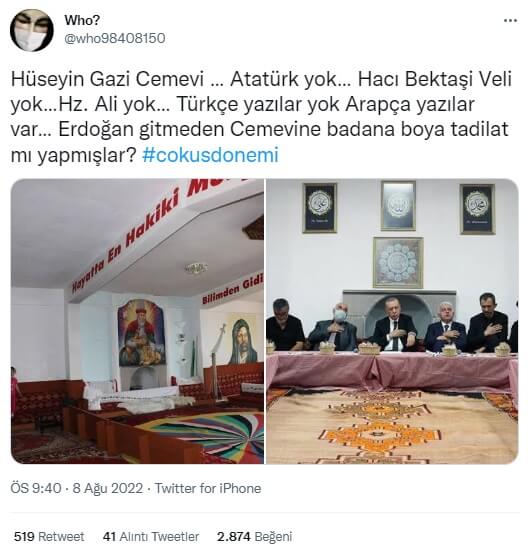 Cumhurbaşkanı Erdoğan’ın ziyaretinde cemevinde arkasında yer alan duvarda Hz. Ali, Hacı Bektaş-ı Veli ve Atatürk resimleri yerine Arapça Allah, Hz. Muhammed, Hz. Ali, Hz. Fatıma, Hz. Hasan ve Hz. Hüseyin isimlerinin yazılı tabloların bulunduğu görüldü.