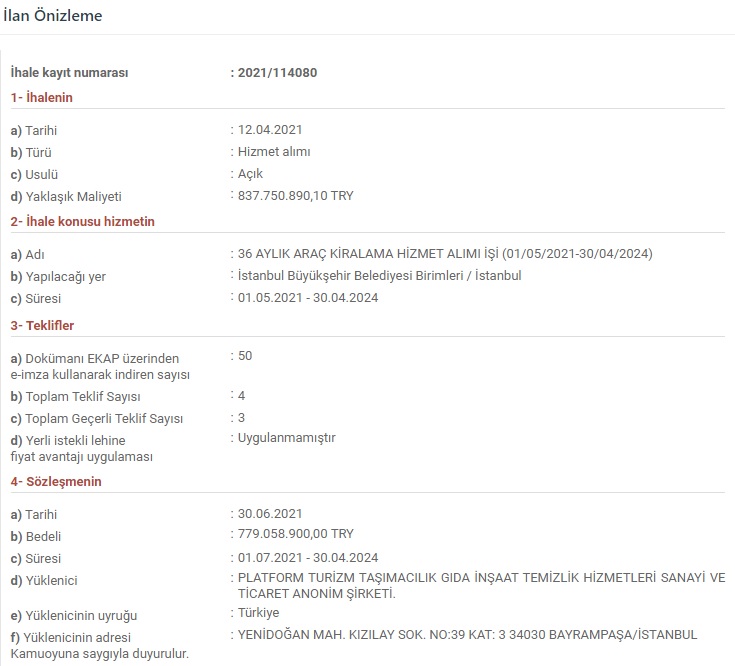İstanbul Büyükşehir Belediyesi (Destek Hizmetleri Şube Müdürlüğü) tarafından açılan 2021/114080 kayıt sayılı 11.03.2021 onay tarihli “36 Aylık Araç Kiralama Hizmet Alımı İşi (01/05/2021-30/04/2024)” adlı ihale “XXX GIDA İNŞAAT TEMİZLİK HİZMETLERİ SANAYİ VE TİCARET ANONİM ŞİRKETİ” tarafından kazanılmış (Aynı şekilde, 2018/586860 kayıt numaralı “2019 yılı araç kiralama hizmet alım işi” adlı (sürücülü cenaze aracı teminini içeren) ihaleyi de aynı şirket almış).