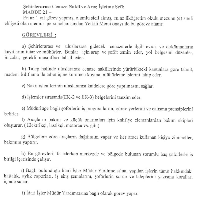 İstanbul Büyükşehir Belediyesi Mezarlıklar Şube Müdürlüğü Görev ve Çalışma Yönetmeliği Uygulama Esas ve Usulleri maddeleri arasında cenaze nakil aracı şoförlerine dair bir detay sunulmadığı; ancak, 21. maddede şehirlerarası cenaze nakil ve araç işletme şefi için “müdürlüğe bağlı şoförlerin iş programlarını, görev yerlerini ve çalışma prensiplerini belirler” hükmüne yer verildiği görülmektedir.