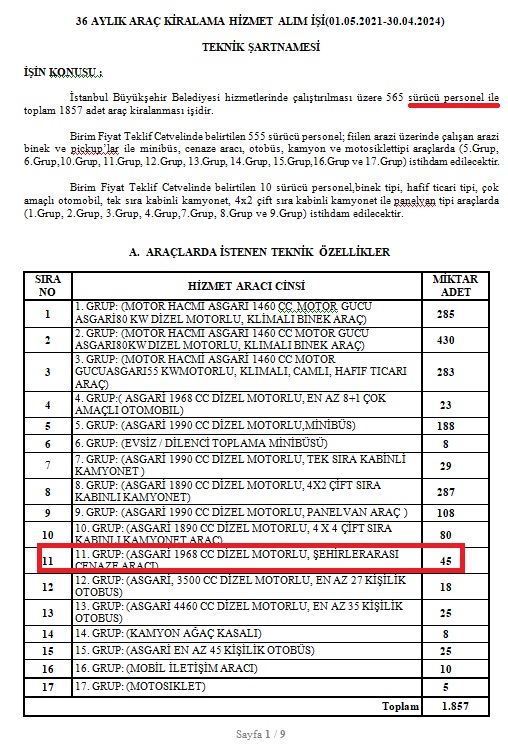 Bahsi geçen ihalenin teknik şartnamesinde sürücü personel ile birlikte “Asgari 1968 CC Dizel Motorlu, Şehirlerarası Cenaze Aracı” temininin yer aldığı görülebiliyor.