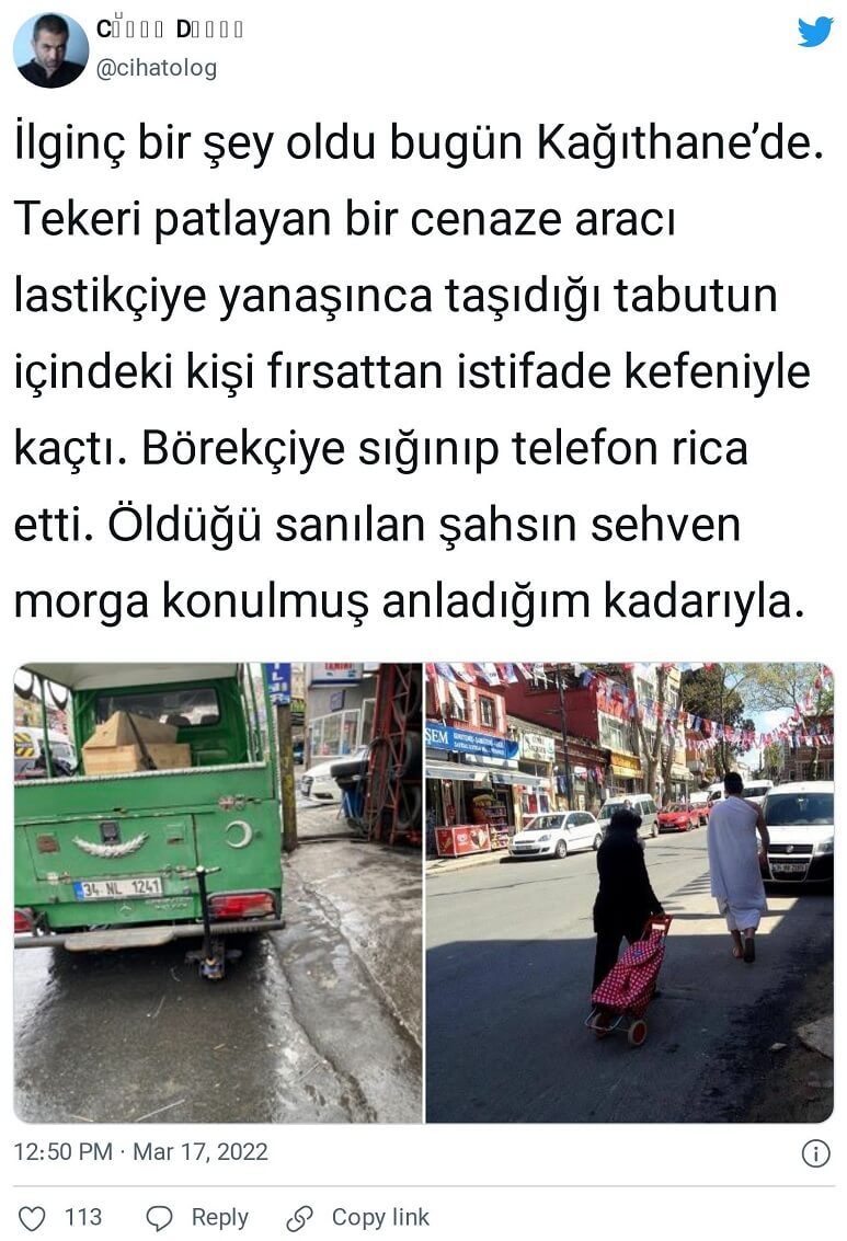 “İlginç bir şey oldu bugün Kağıthane’de. Tekeri patlayan bir cenaze aracı lastikçiye yanaşınca taşıdığı tabutun içindeki kişi fırsattan istifade kefeniyle kaçtı. Börekçiye sığınıp telefon rica etti. Öldüğü sanılan şahsın sehven morga konulmuş anladığım kadarıyla.”