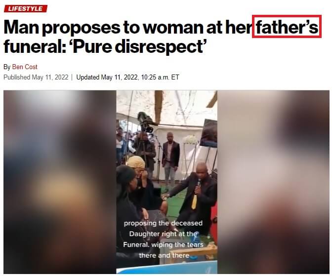 Basına ve sosyal medyaya yansıyan aktarımlarda Güney Afrikalı bir papazın, babasının cenazesinde ağlayan kız arkadaşına, babasının tabutun önünde evlenme teklif ettiği, evlilik teklifi esnasında böylesi zorlu bir süreçte kız arkadaşının hayatında olduğu için Tanrı’ya şükrettiği, babasının ölümüyle yüzleşirken hayatındaki rolünün kız arkadaşının kalbini rahatlatacağını söylediği belirtildi.