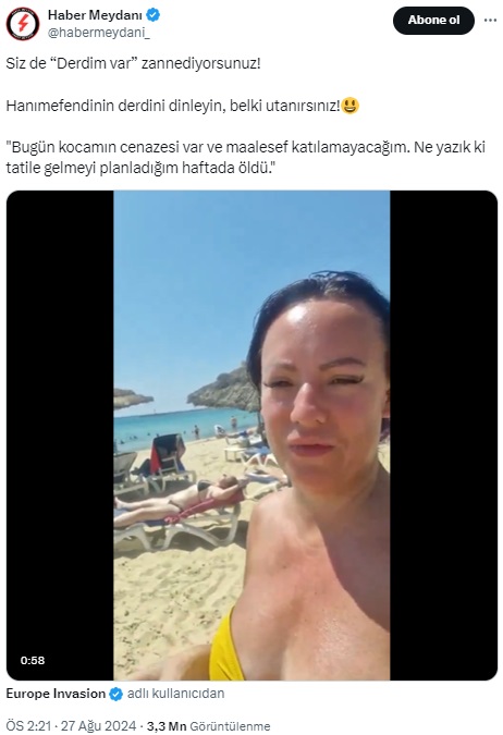 Haber Meydanı (@habermeydani_): “Siz de “Derdim var” zannediyorsunuz! Hanımefendinin derdini dinleyin, belki utanırsınız! “Bugün kocamın cenazesi var ve maalesef katılamayacağım. Ne yazık ki tatile gelmeyi planladığım haftada öldü.””