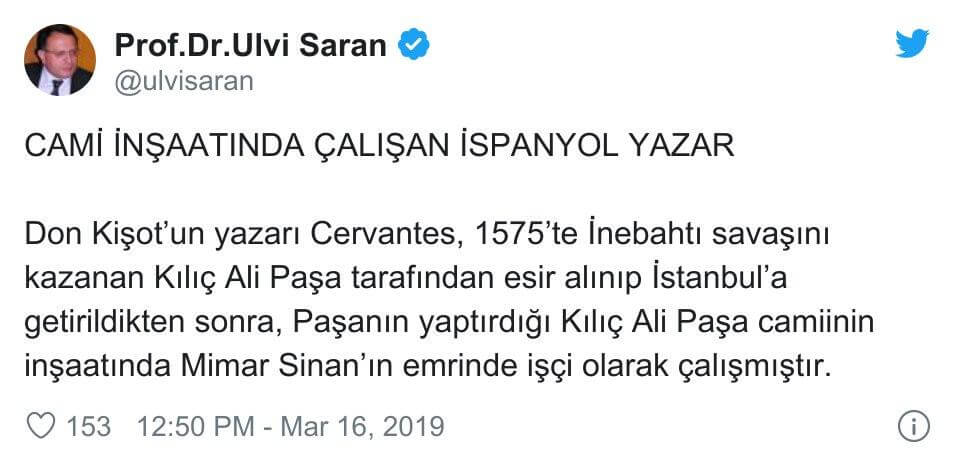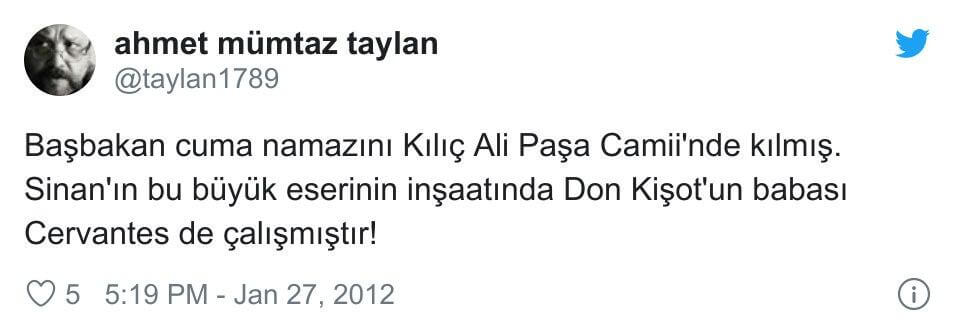 Ahmet Mümtaz Taylan’ın Cervantes’in İstanbul’da esir olarak Kılıç Ali Paşa Camii’nde çalıştığı iddiasını aktardığı paylaşımı