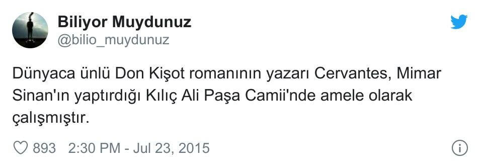 “Dünyaca ünlü Don Kişot romanının yazarı Cervantes, Mimar Sinan’ın yaptırdığı Kılıç Ali Paşa Camii’nde amele olarak çalışmıştır.”