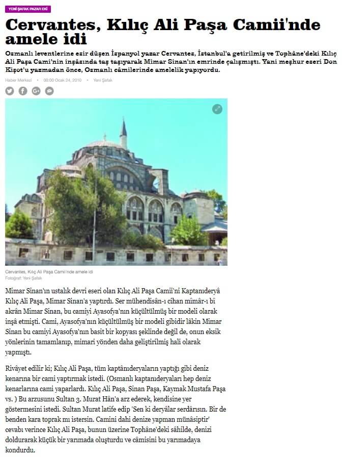 Yeni Şafak ise 24 Ocak 2010 tarihinde yayımladığı “Cervantes, Kılıç Ali Paşa Camii’nde amele idi” başlıklı metinde bu iddiayı şöyle aktarmıştı: