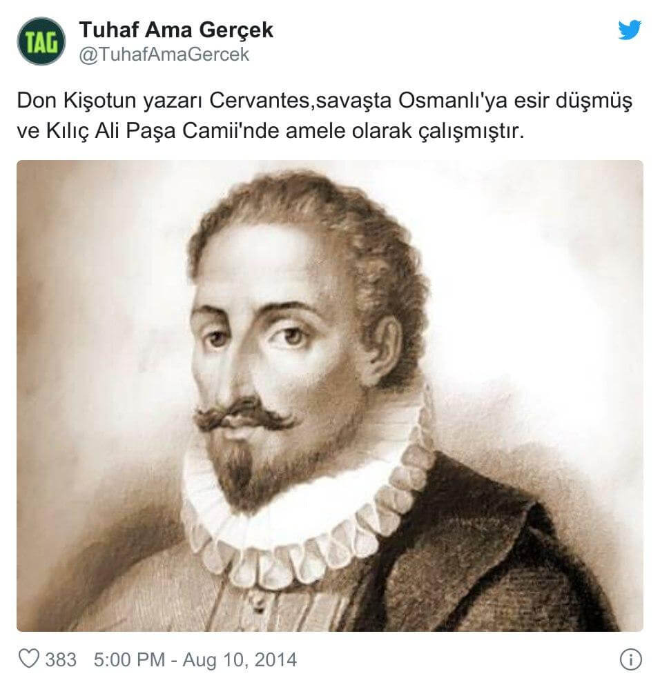 Don Kişot’un yazarı Cervantes, 1575’te İnebahtı savaşını kazanan Kılıç Ali Paşa tarafından esir alınıp İstanbul’a getirildikten sonra, Paşanın yaptırdığı Kılıç Ali Paşa camiinin inşaatında Mimar Sinan’ın emrinde işçi olarak çalışmıştır.”