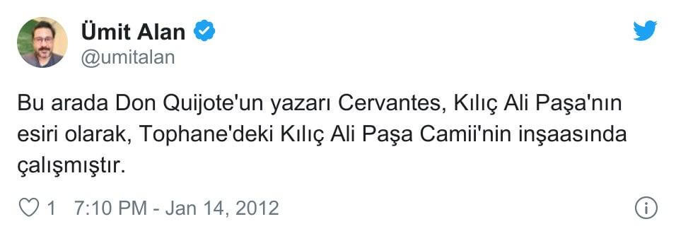 Ümit Alan’ın Cervantes’in İstanbul’da esir olarak Kılıç Ali Paşa Camii’nde çalıştığı iddiasını aktardığı paylaşımı