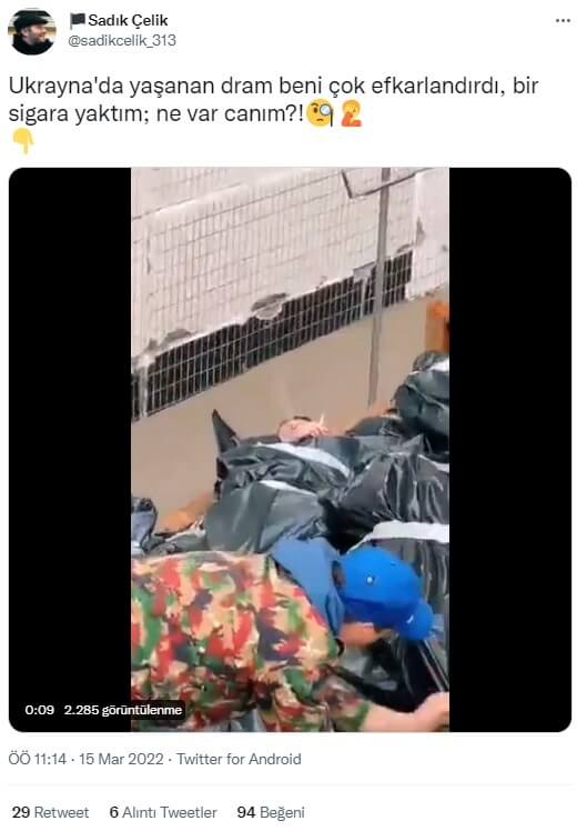 Bugünkü konumuz, Ukrayna’da benzer bir “kayıp mizanseni” kurgulandığı iddiasıyla paylaşılan, ceset torbasıyla sigara içen kişinin görüldüğü video.