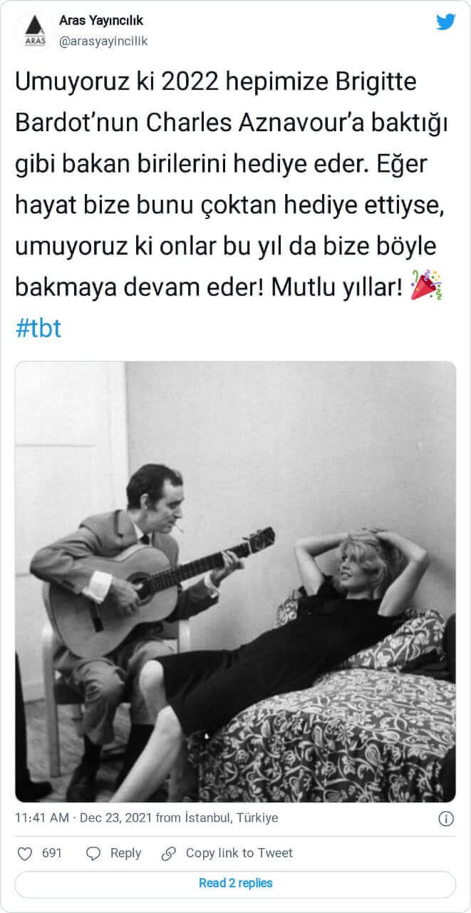 “Umuyoruz ki 2022 hepimize Brigitte Bardot’nun Charles Aznavour’a baktığı gibi bakan birilerini hediye eder. Eğer hayat bize bunu çoktan hediye ettiyse, umuyoruz ki onlar bu yıl da bize böyle bakmaya devam eder! Mutlu yıllar! 🎉 #tbt”