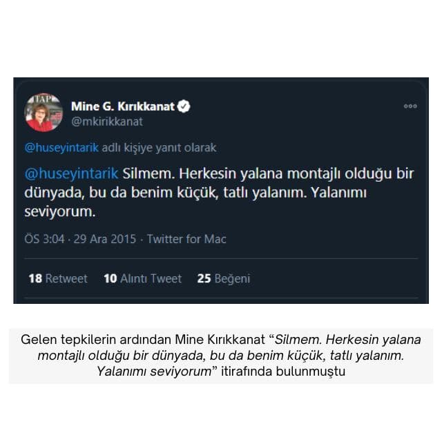 Gelen tepkilerin ardından Mine Kırıkkanat “Silmem. Herkesin yalana montajlı olduğu bir dünyada, bu da benim küçük, tatlı yalanım. Yalanımı seviyorumitirafında bulunmuştu.