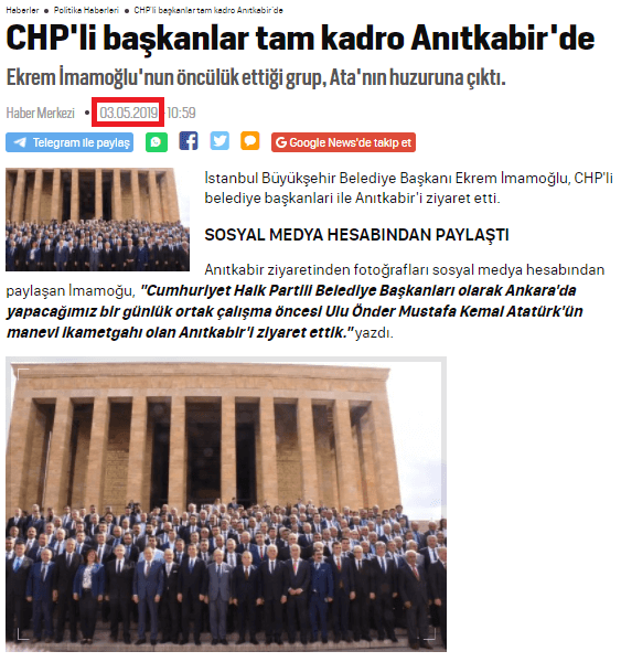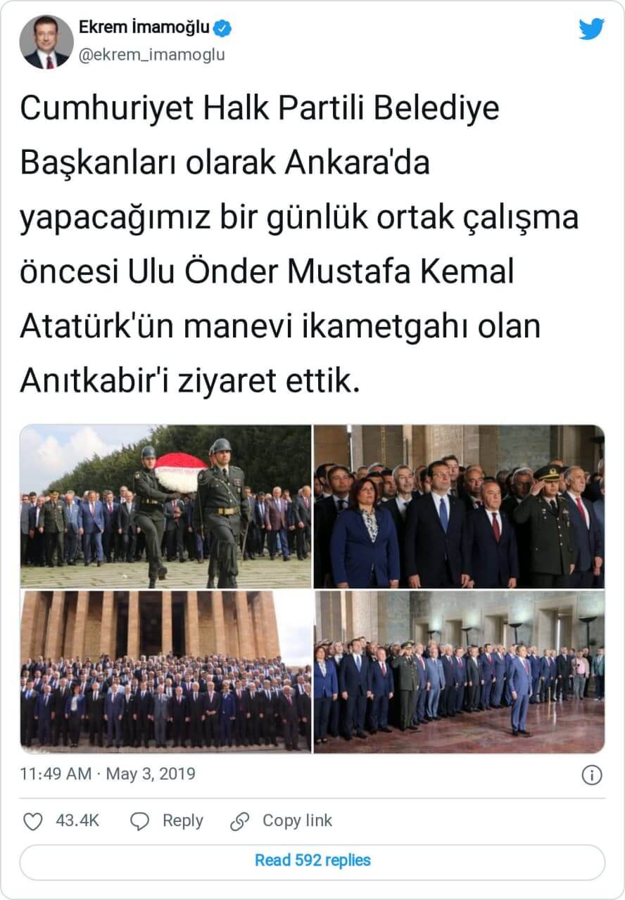 Fotoğraf 3 Mayıs 2019 tarihinde Ekrem İmamoğlu, Mustafa Kayalar, Mehmet Oktay gibi birçok belediye başkanınca sosyal medya hesaplarında “Cumhuriyet Halk Partili Belediye Başkanları olarak Ankara’da yapacağımız bir günlük ortak çalışma öncesi Ulu Önder Mustafa Kemal Atatürk’ün manevi ikametgahı olan Anıtkabir’i ziyaret ettik.” ifadeleriyle paylaşılmıştı.