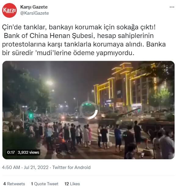 “Çin’de bir başka bankanın halkın parasına el koyması üzerine Çin ordusuna ait tankların bankayı korumaya aldığı belirtiliyor. Zira Bank of China’nın Henan şubesi, insanların şubelerindeki birikimlerinin artık ‘yatırım ürünü’ olduğunu ve geri çekilemeyeceğini ilan ediyor.”