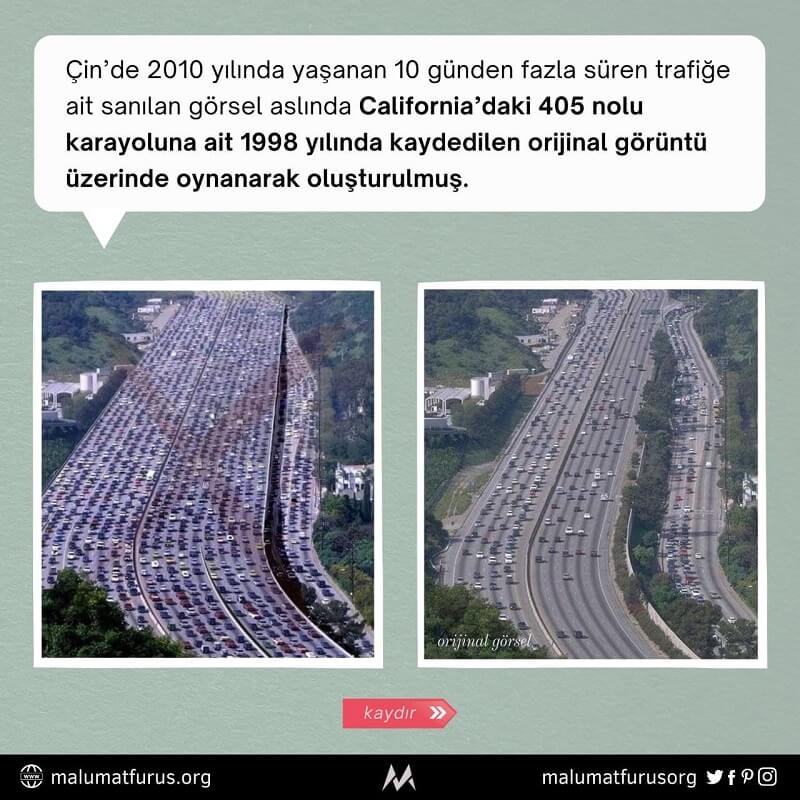Çin’de 2010 yılında yaşanan yoğun trafiğe ait olduğu iddiasıyla paylaşılan görsel, California’daki 405 nolu karayoluna ait 1998 yılında kaydedilen orijinal görüntü üzerinde oynanarak oluşturulmuş.