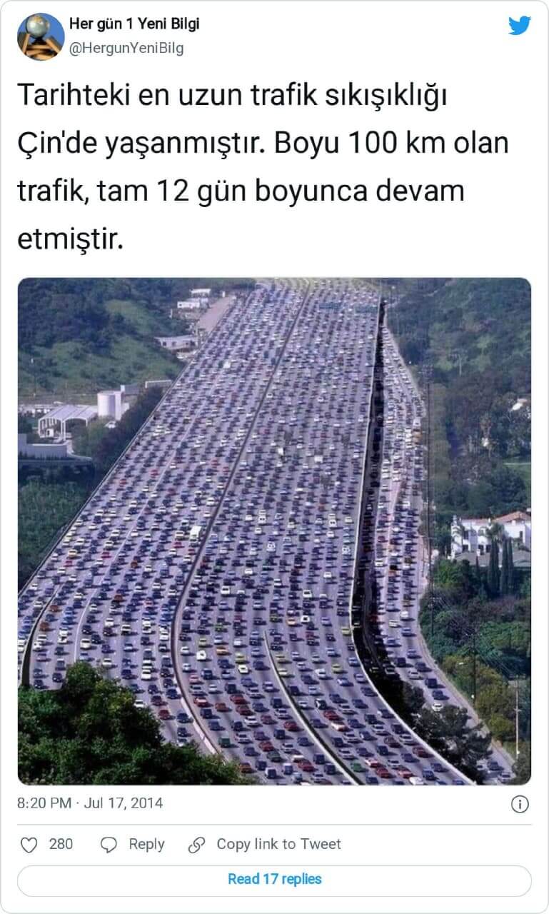 “Tarihteki en uzun trafik sıkışıklığı Çin’de yaşanmıştır. Boyu 100 km olan trafik, tam 12 gün boyunca devam etmiştir.