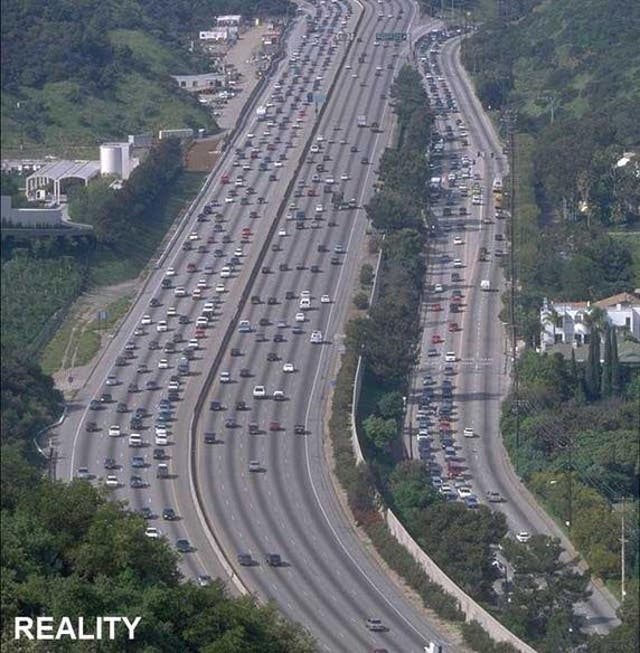 ABD’nin Los Angeles eyaletindeki California şehrinin kuzeyinde yer alan I-405 (Interstate 405) otoyoluna ait orijinal görüntü üzerinde oynanarak bu görsel oluşturulmuş.