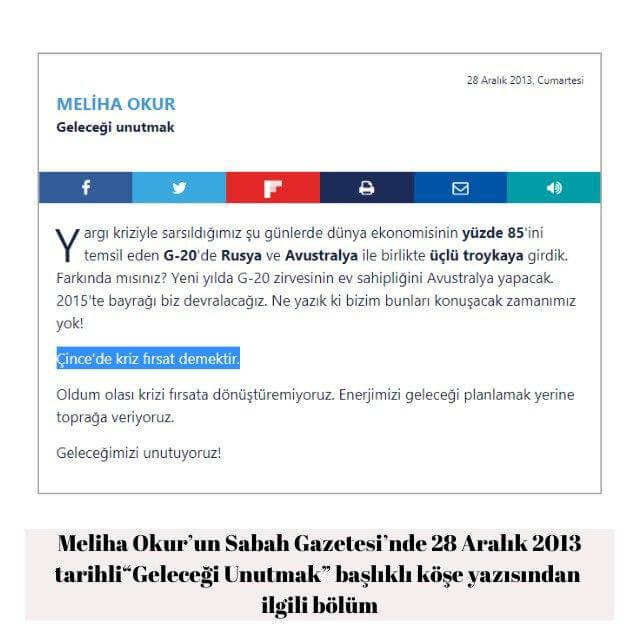 Meliha Okur’un Sabah Gazetesi’nde 28 Aralık 2013 tarihinde yayınlanan “Geleceği Unutmak” başlıklı köşe yazısından: