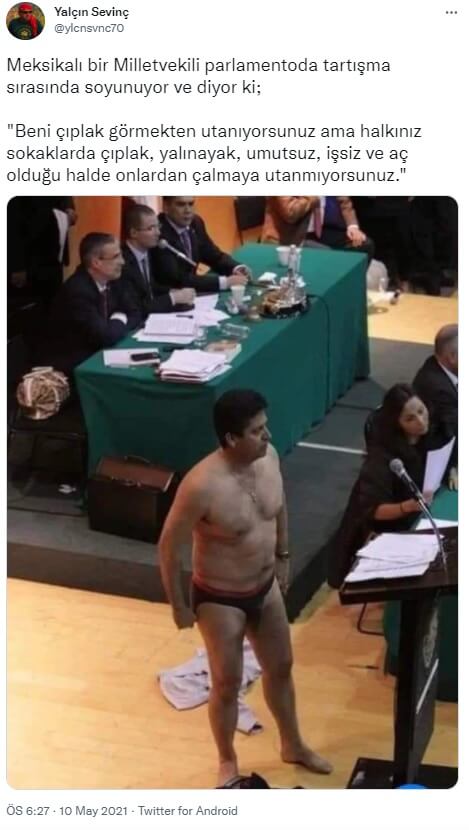 “Meksikalı bir Milletvekili parlamentoda tartışma sırasında soyunuyor ve diyor ki; “Beni çıplak görmekten utanıyorsunuz ama halkınız sokaklarda çıplak, yalınayak, umutsuz, işsiz ve aç olduğu halde onlardan çalmaya utanmıyorsunuz.””
