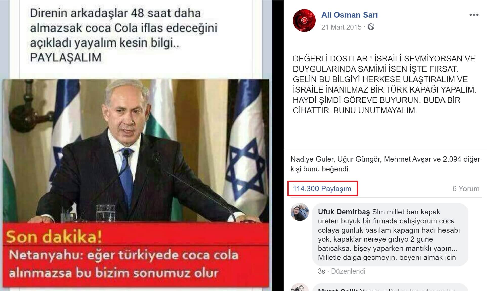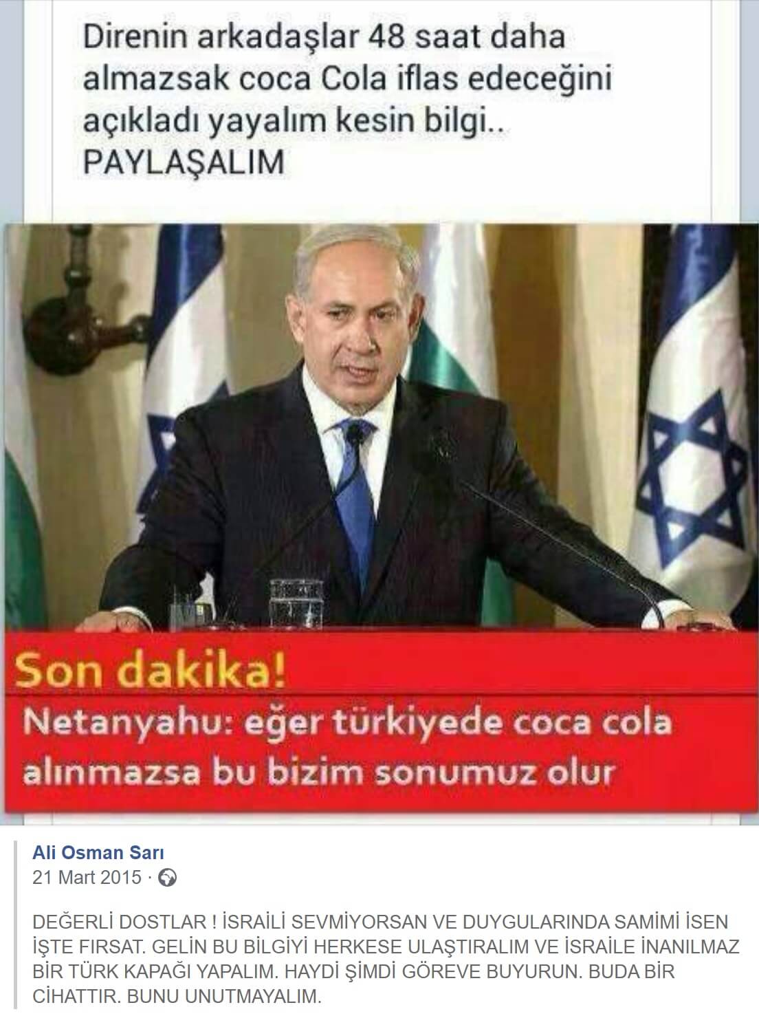 21 Mart 2015’te Ali Osman Sarı’nın paylaştığı “48 saat daha almazsak Coca Cola iflas edeceğini açıkladı” ve “Netenyahu: eğer Türkiye’de Coca Cola alınmazsa bu bizim sonumuz olur” içerikli paylaşımı (işbu yazının hazırlandığı) 16 Nisan 2020’ye değin 114 binin üzerinde paylaşım aldığı görülüyor.