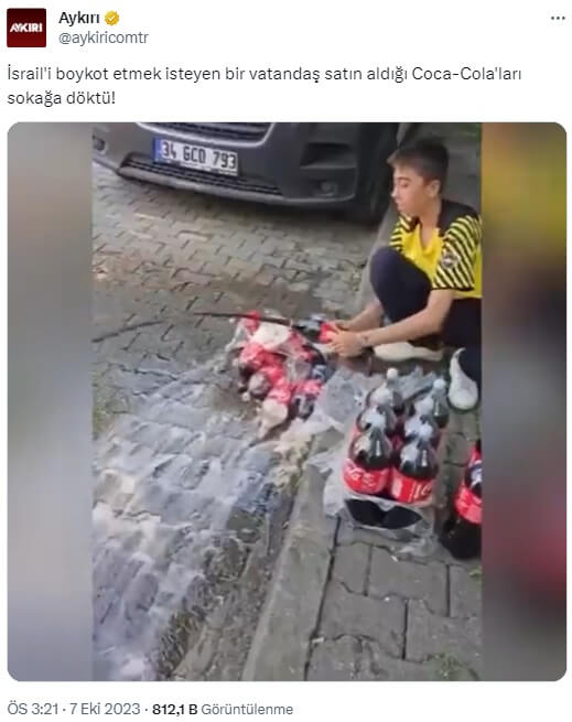 Aykırı (@aykiricomtr): “İsrail’i boykot etmek isteyen bir vatandaş satın aldığı Coca-Cola’ları sokağa döktü!”