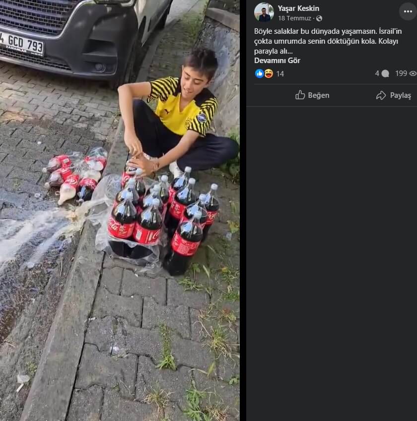 Coca-Cola şişelerinin İsrail’i protesto amacıyla sokaklara boşaltıldığı (arka planda bir erkeğin (“Dök onu da. İsrail’i boykot” dediği duyulan) video 2023 yılı Temmuz ayında sosyal medya platformlarında paylaşılmış.