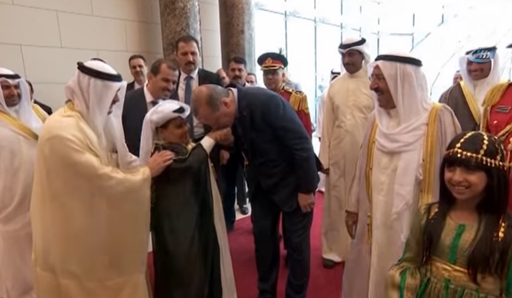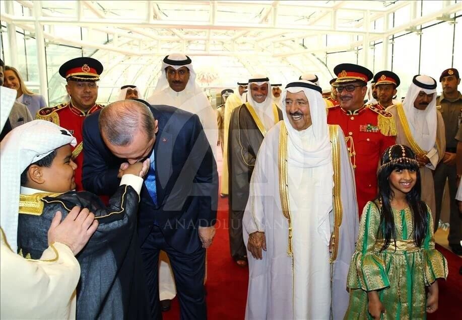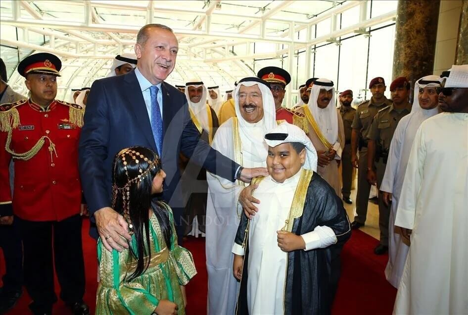 “Cumhurbaşkanı Recep Tayyip Erdoğan Kuveyt’e gelişinde, Kuveyt Emiri Şeyh Sabah Ahmed Cabir el Sabah tarafından resmi törenle karşılandı. Heyetlerin takdiminin ardından iki Kuveytli çocuk, Erdoğan ve Kuveyt Emiri el Sabah’a çiçek sundu.”