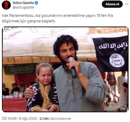 Solcu Gazete (@solcugazete): “Irak Parlamentosu, kız çocuklarının evlenebilme yaşını 15’ten 9’a düşürmek için çalışma başlattı.”