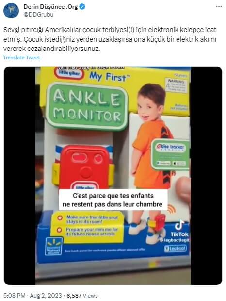 Derin Düşünce .Org (@DDGrubu): “Sevgi pıtırcığı Amerikalılar çocuk terbiyesi(!) için elektronik kelepçe icat etmiş. Çocuk istediğiniz yerden uzaklaşırsa ona küçük bir elektrik akımı vererek cezalandırabiliyorsunuz.”