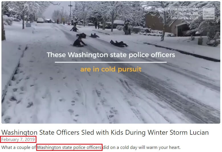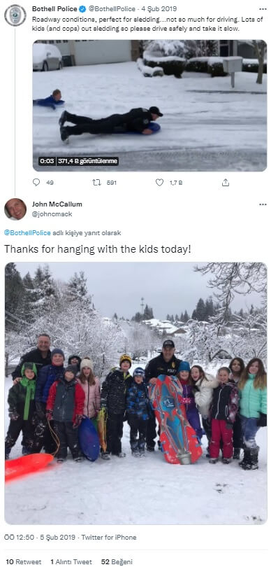 Yoğun kar yağışı sırasında bir grup çocukla birlikte karda kayan Türk polisine ait olduğu iddiasıyla paylaşılan görüntü 2019 yılı Şubat ayında ABD’nin Washington eyaletinin Bothell şehrinde Polis Departmanı tarafından kaydedilmiş.