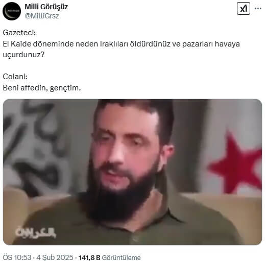 Milli Görüşüz (@MilliGrsz): “Gazeteci: El Kaide döneminde neden Iraklıları öldürdünüz ve pazarları havaya uçurdunuz? Colani: Beni affedin, gençtim.”